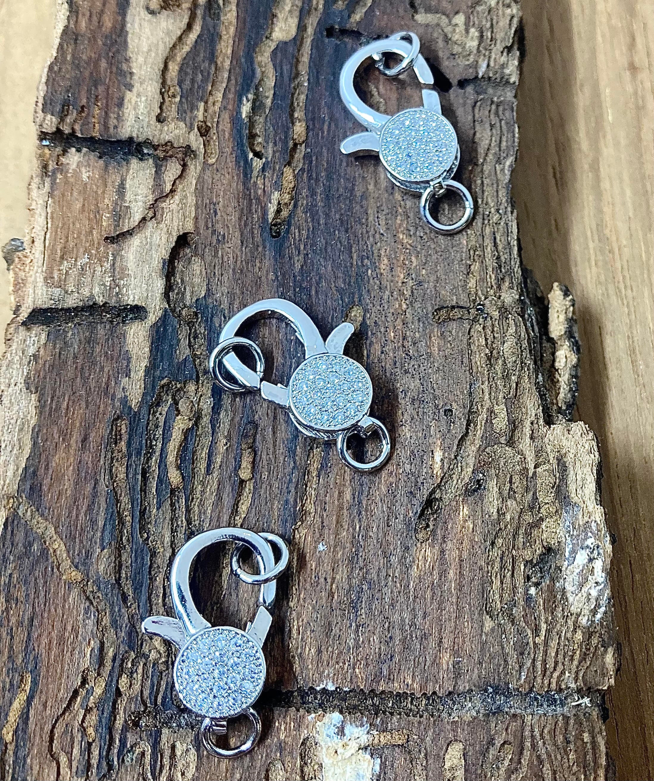 Fermoir mousqueton en métal avec zircons, fermeture simple, rapide et sécurisée.