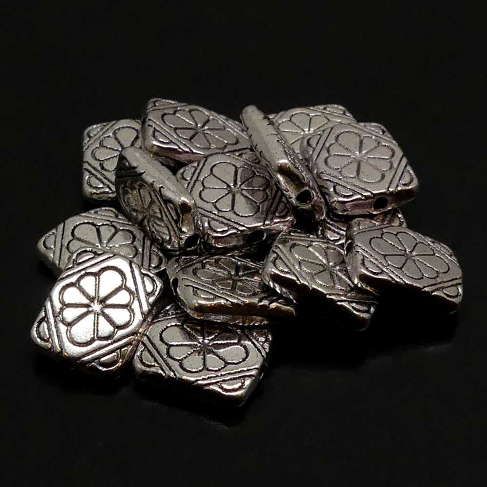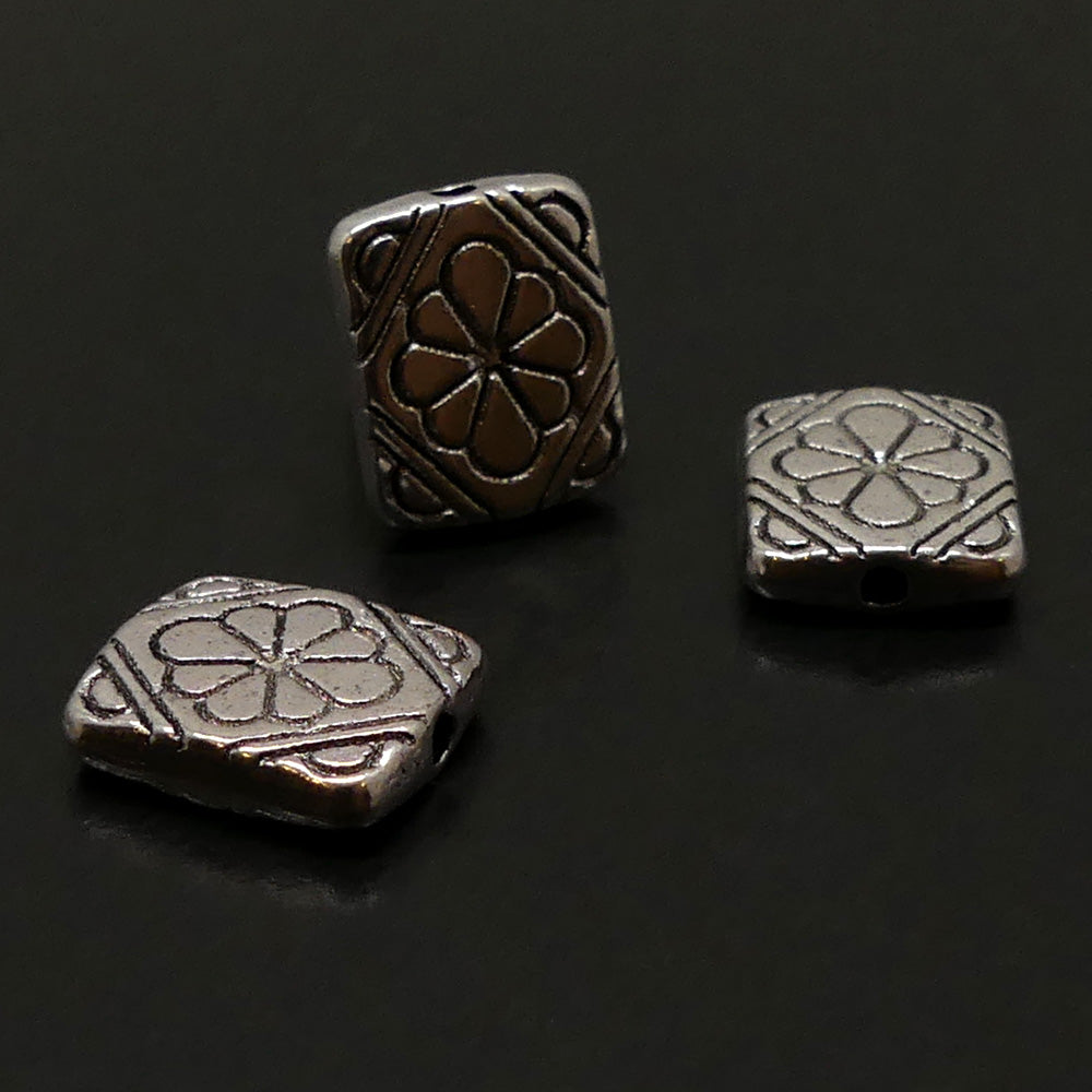 Perle plate, métal argenté, motifs fleurs, 12x10x3 mm, trou 1mm